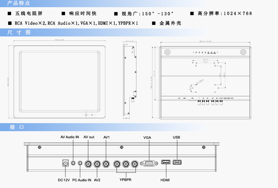 輸入信號:RCA Video×2,RCA Audio×1,VGA×1,HDMI×1,YPBPR×1