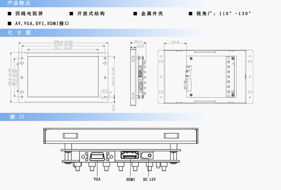 輸入信號:RCA Video×2,RCA Audio×1,VGA×1,DVI×1,HDMI×1