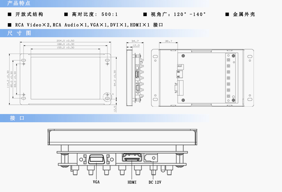 | 輸入信號 | RCA Video×2,RCA Audio×1,VGA×1,DVI×1,HDMI×1 | ||