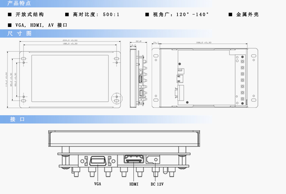 | 輸入信號(hào) | RCA Video×2,RCA Audio×1,VGA×1,DVI×1,HDMI×1 | ||