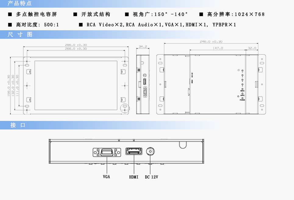 | 輸入信號(hào) | RCA Video×2,RCA Audio×1,VGA×1,DVI×1,HDMI×1 | ||