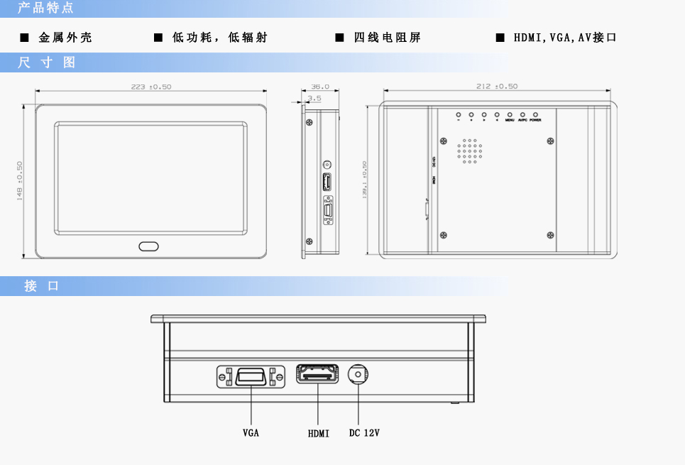 | 輸入信號(hào) | RCA Video×2,RCA Audio×1,VGA×1,DVI×1,HDMI×1 | ||
